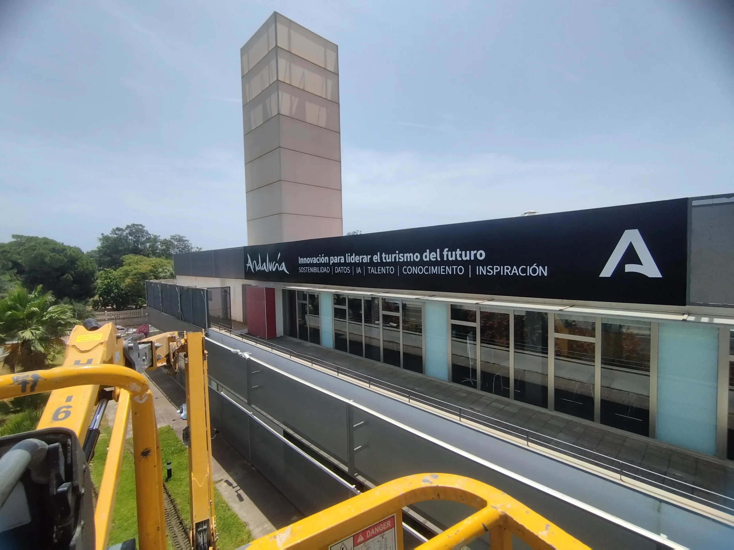 El trabajo incluyó la fabricación e instalación de rótulos frontales de grandes dimensiones en las fachadas principales, con materiales de alta durabilidad y un acabado limpio y contemporáneo. El diseño debía integrar la identidad visual de la marca Andalucía y transmitir coherencia institucional, garantizando legibilidad y presencia desde largas distancias.
