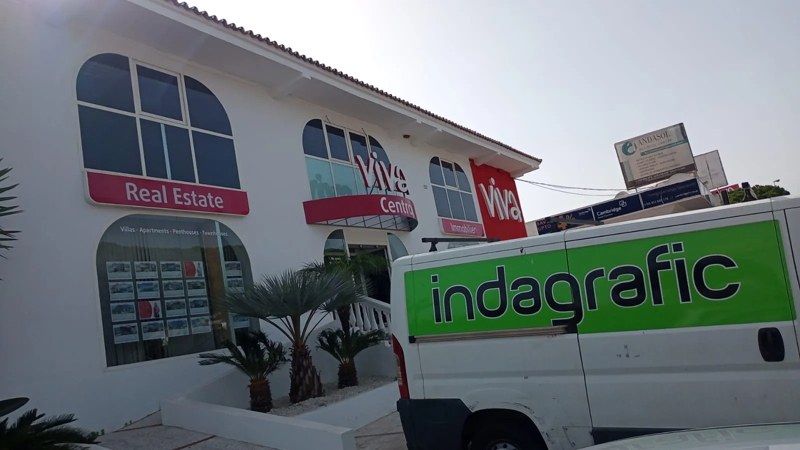 Indagrafic desarrolló un proyecto integral de rotulación exterior para Viva Marbella, inmobiliaria referente en la Costa del Sol. El objetivo fue claro: renovar por completo la fachada principal de su oficina, creando una identidad visual coherente con la marca y con alto impacto en un entorno competitivo.