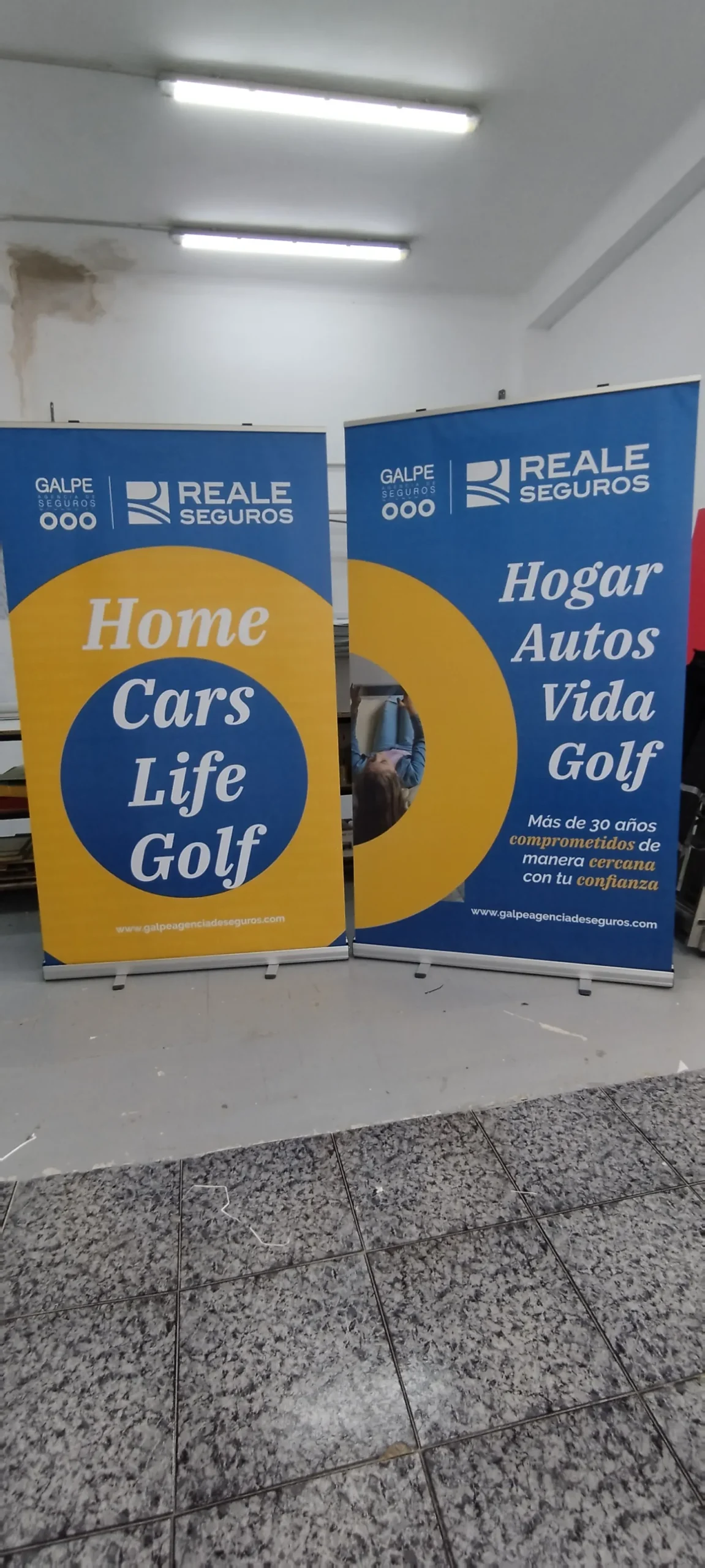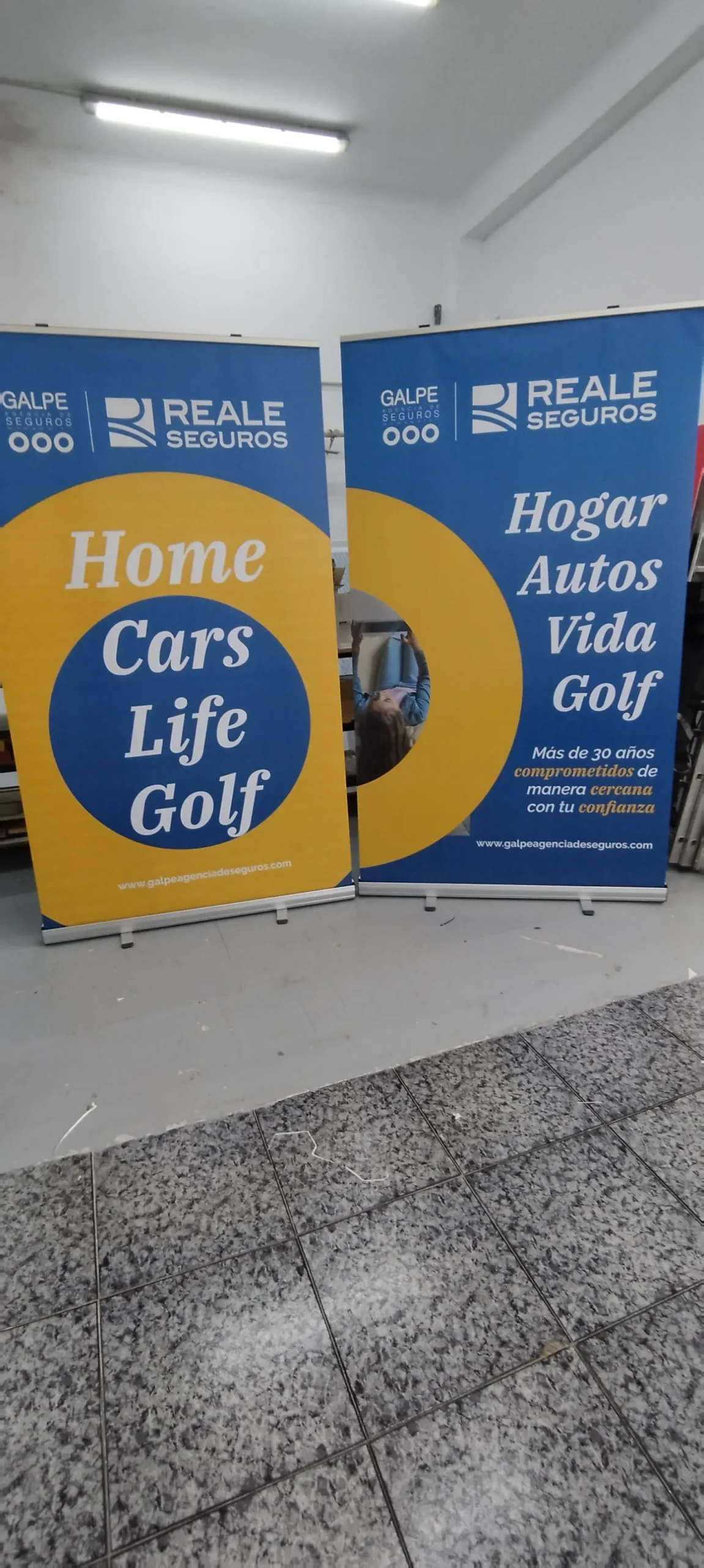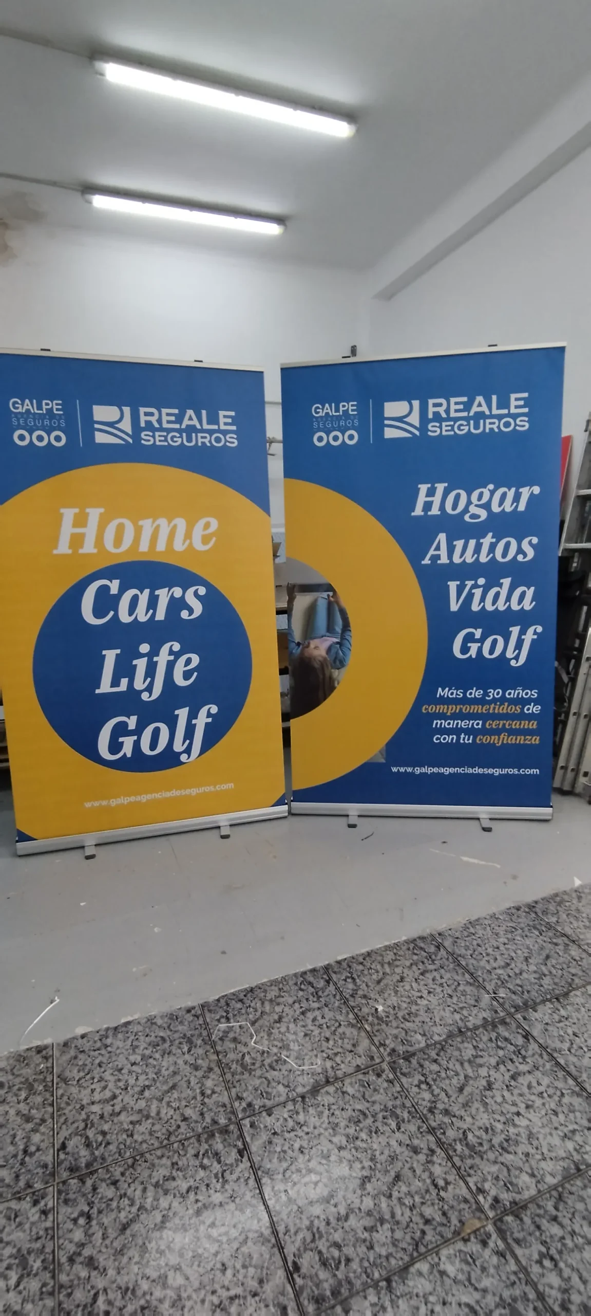 Galpe Agencia de Seguros: Diseño y producción de roll-ups corporativos para eventos y puntos de atención al cliente.