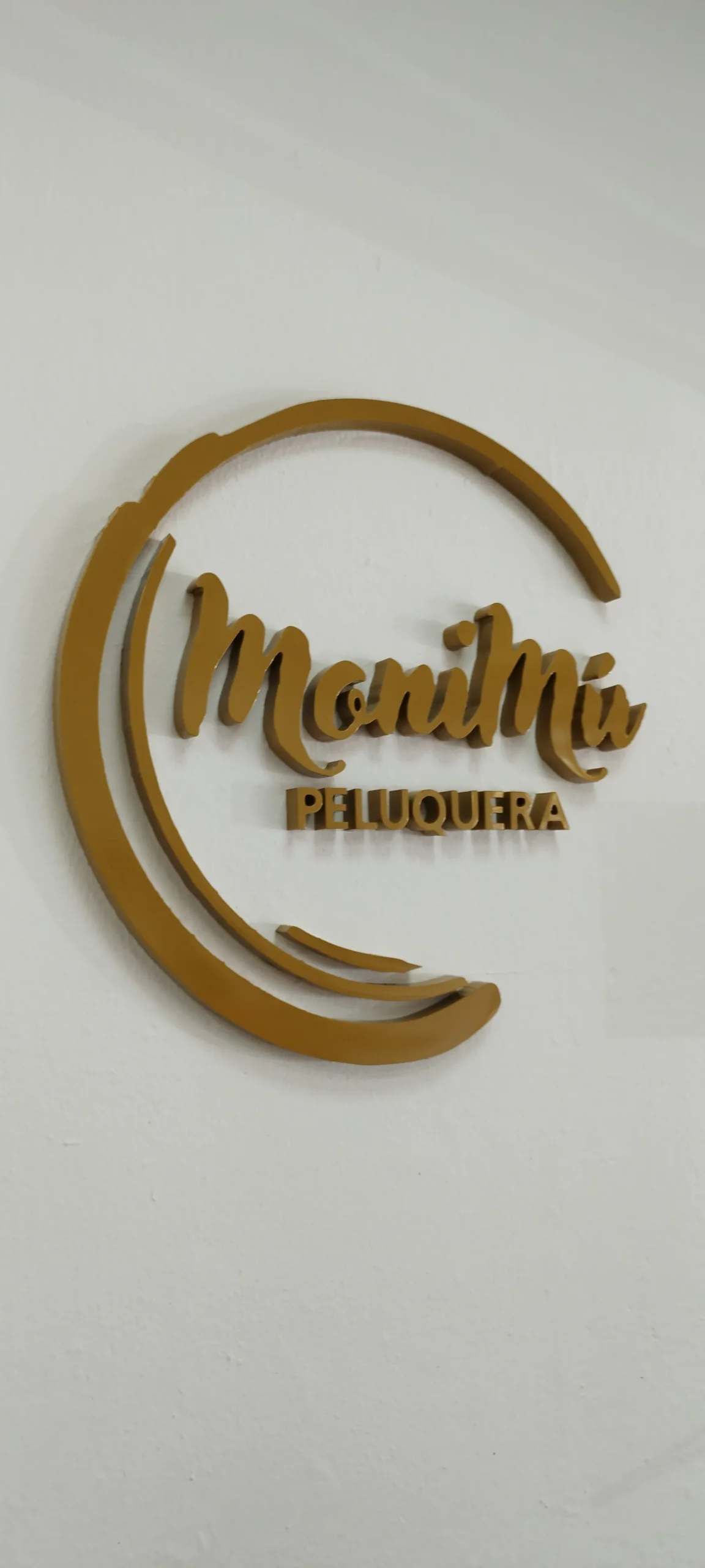 Producción del logotipo “MoniMú Peluquera” en relieve con acabado dorado satinado, instalado sobre superficie blanca para maximizar contraste y elegancia.